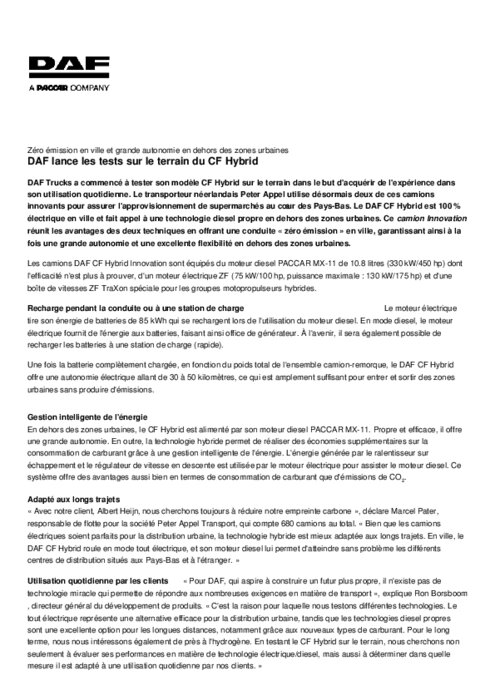 DAF Trucks a commencé à tester son modèle CF Hybrid sur le terrain dans le but d'acquérir de l'expérience dans son utilisation quotidienne. Le transporteur néerlandais Peter Appel utilise désormais deux de ces camions innovants pour assurer l'approvisionnement de supermarchés au cœur des Pays-Bas. Le DAF CF Hybrid est 100 % électrique en ville et fait appel à une technologie diesel propre en dehors des zones urbaines...