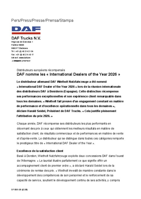 Le distributeur allemand DAF Wietholt Nutzfahrzeuge a été nommé « International DAF Dealer of the Year 2026 » lors de la réunion internationale des distributeurs DAF à Benidorm (Espagne). Cette distinction récompense ses performances exceptionnelles et son expérience client remarquable dans tous les domaines. « Wietholt fait preuve d'un engagement constant en matière de performance et d'excellence opérationnelle dans tous les domaines », déclare Harald Seidel, Président de DAF Trucks. « Cela justifie pleinement l'attribution du prix 2026. »