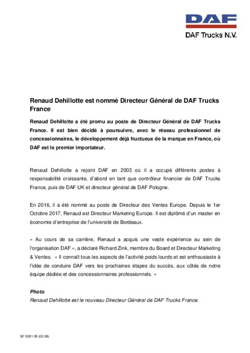 Renaud Dehillotte a été promu au poste de Directeur Général de DAF Trucks France. Il est bien décidé à poursuivre, avec le réseau professionnel de concessionnaires, le développement déjà fructueux de la marque en France, où DAF est le premier importateur.