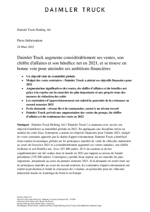 Daimler Truck a maintenu avec succès son objectif d'améliorer sa rentabilité globale en 2021. En appliquant une discipline stricte en matière de coûts fixes, l'entreprise a atteint ses objectifs financiers pour l’année 2021, malgré les vents contraires apportés par la chaîne d'approvisionnement. Daimler Truck a bénéficié d'une reprise économique globale sur les principaux marchés de vente de véhicules industriels au cours de l'exercice 2021 et a considérablement augmenté ses ventes unitaires...