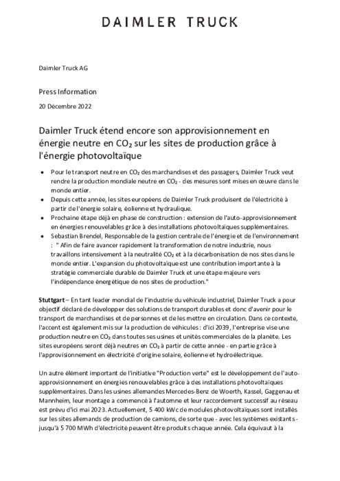 En tant leader mondial de l’industrie du véhicule industriel, Daimler Truck a pour objectif déclaré de développer des solutions de transport durables et donc d'avenir pour le transport de marchandises et de personnes et de les mettre en circulation. Dans ce contexte, l'accent est également mis sur la production de véhicules : d'ici 2039, l'entreprise vise une production neutre en CO₂ dans toutes ses usines et unités commerciales de la planète.