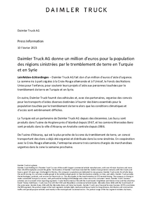 Daimler Truck AG fait don d’un million d’euros d’aide d’urgence. La somme ira à parts égales à la Croix-Rouge allemande et à l’Unicef, le Fonds des Nations Unies pour l’enfance, pour soutenir leurs projets d’aide aux personnes touchées par le tremblement de terre en Turquie et en Syrie.
