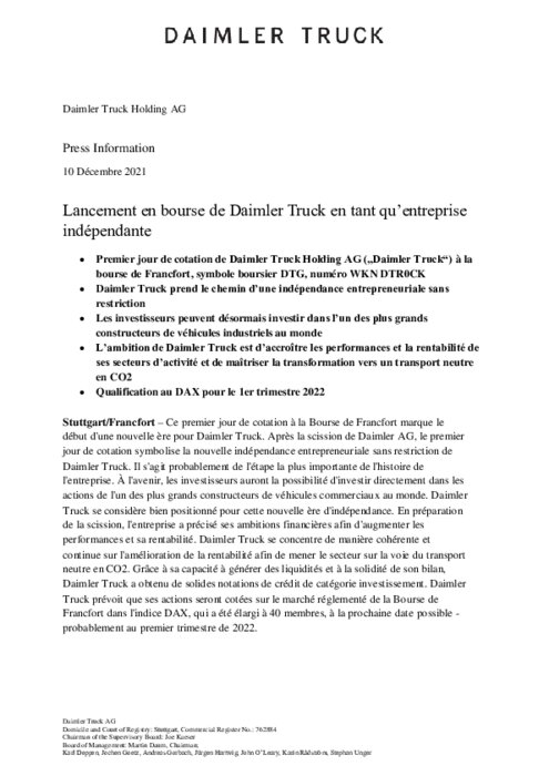 "Aujourd'hui est un jour historique pour Daimler Truck : notre entreprise de camions et d'autobus faisait partie du groupe Daimler depuis 125 ans. Nous devenons maintenant une société indépendante cotée en bourse", comptant près de 100.000 salariés, a déclaré M. Daum, cité dans un communiqué.