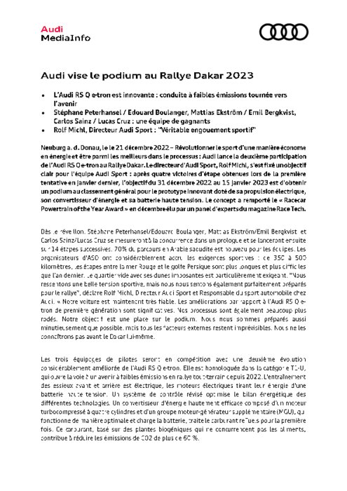 Le directeur d’Audi Sport, Rolf Michl, s’est fixé un objectif clair pour l’équipe Audi Sport : après quatre victoires d’étape obtenues lors de la première tentative en janvier dernier, l’objectif du 31 décembre 2022 au 15 janvier 2023 est d’obtenir un podium au classement général pour le prototype innovant doté de sa propulsion électrique, son convertisseur d’énergie et sa batterie haute tension.