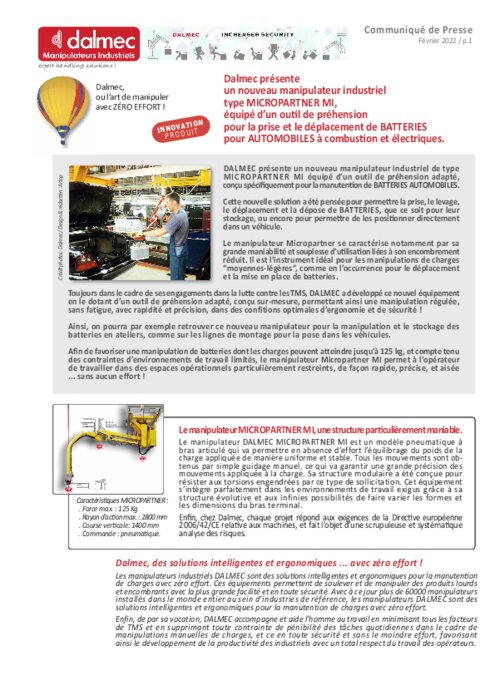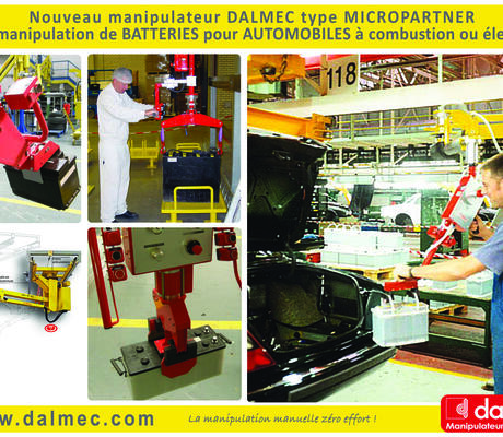 DALMEC présente un nouveau manipulateur industriel de type MICROPARTNER MI équipé d’un outil de préhension adapté, conçu spécifiquement pour la manutention de BATTERIES AUTOMOBILES. Cette nouvelle solution a été pensée pour permettre la prise, le levage, le déplacement et la dépose de BATTERIES, que ce soit pour leur stockage, ou encore pour permettre de les positionner directement dans un véhicule...