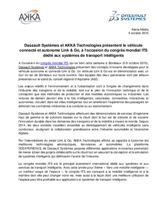 A l’occasion du congrès mondial ITS qui se tient cette semaine à Bordeaux (5-9 octobre 2015), Dassault Systèmes et AKKA Technologies présentent des concepts innovants développés pour le véhicule autonome et connecté Link & Go. Un véhicule Link & Go est en démonstration avec un tour du lac de Bordeaux sur route ouverte. Des équipes des deux partenaires sont par ailleurs présentes sur le stand du conseil régional d’Aquitaine (A62).