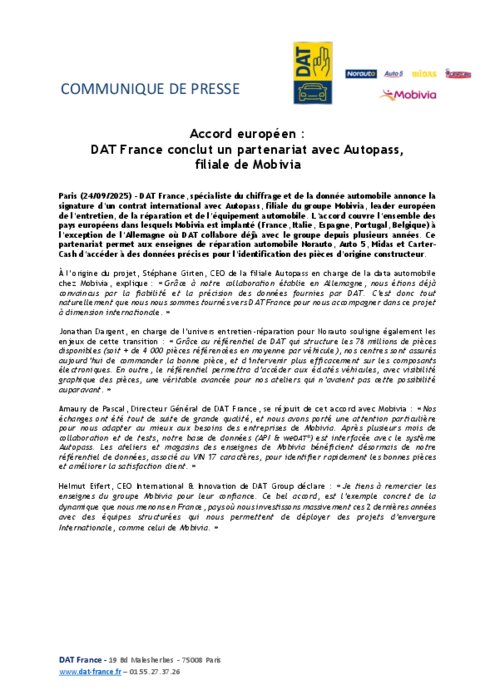 DAT France, spécialiste du chiffrage et de la donnée automobile annonce la signature d’un contrat international avec Autopass, filiale du groupe Mobivia, leader européen de l’entretien, de la réparation et de l’équipement automobile. L’accord couvre l’ensemble des pays européens dans lesquels Mobiviaest implanté (France, Italie, Espagne, Portugal, Belgique) à l’exception de l’Allemagne où DAT collabore déjà avec le groupe depuis plusieurs années. Ce partenariat permet aux enseignes de réparation automobile Norauto, Auto5, Midas et Carter-Cash d’accéder à des données précises pour l’identification des pièces d’origine constructeur.
