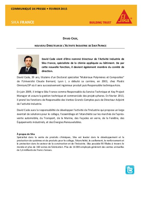 DAVID CADE, NOUVEAU DIRECTEUR DE L'ACTIVITE INDUSTRIE DE SIKA FRANCE