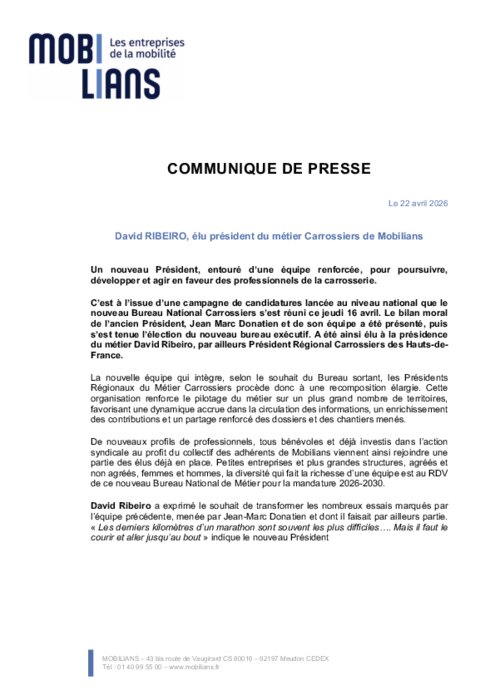 C’est à l’issue d’une campagne de candidatures lancée au niveau national que le nouveau Bureau National Carrossiers s’est réuni ce jeudi 16 avril. Le bilan moral de l’ancien Président, Jean Marc Donatien et de son équipe a été présenté, puis s’est tenue l’élection du nouveau bureau exécutif. A été ainsi élu à la présidence du métier David Ribeiro, par ailleurs Président Régional Carrossiers des Hauts-de-France.