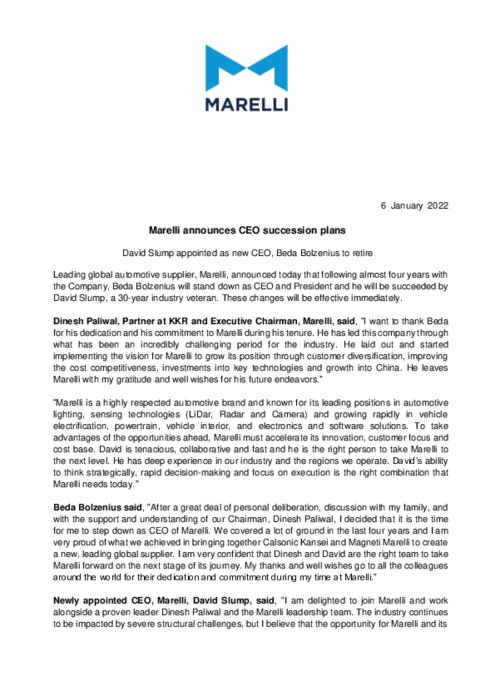 Marelli, l'un des principaux équipementiers automobiles mondiaux, a annoncé qu'après presque quatre années passées au sein de la société, Beda Bolzenius quittera ses fonctions de PDG et de président et sera remplacé par David Slump, un vétéran de l'industrie depuis 30 ans. Ces changements prennent effet immédiatement.