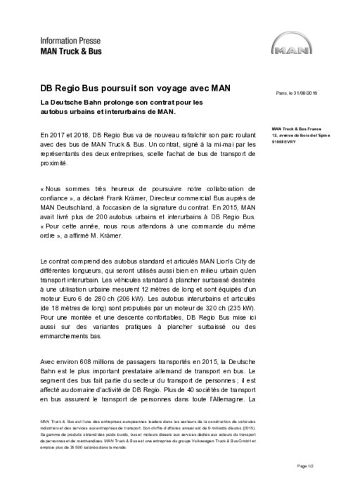 Constructeurs 31 août 2016 - 13:52 En 2017 et 2018, DB Regio Bus va de nouveau rafraîchir son parc roulant avec des bus de MAN Truck & Bus. Un contrat, signé à la mi-mai par les représentants des deux entreprises, scelle l'achat de bus de transport de proximité. PDF (229 Ko) Télécharger