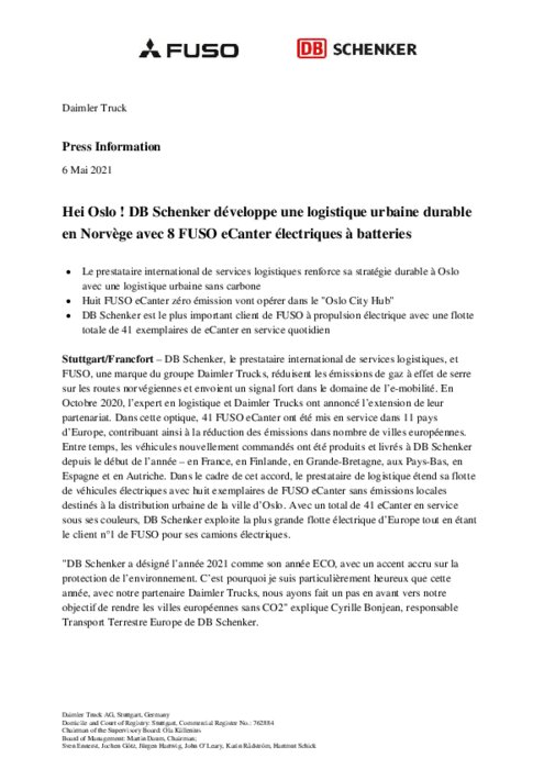 DB Schenker, le prestataire international de services logistiques, et FUSO, une marque du groupe Daimler Trucks, réduisent les émissions de gaz à effet de serre sur les routes norvégiennes et envoient un signal fort dans le domaine de l’e-mobilité. En Octobre 2020, l’expert en logistique et Daimler Trucks ont annoncé l’extension de leur partenariat. Dans cette optique, 41 FUSO eCanter ont été mis en service dans 11 pays d’Europe, contribuant ainsi à la réduction des émissions...