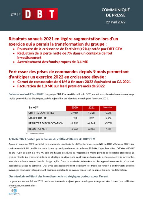Après un exercice 2020 perturbé pour cause de pandémie, le chiffre d’affaires consolidé de DBT affiche en 2021 une croissance de 9,3%, bénéficiant de la bonne dynamique du marché de la mobilité électrique. Le chiffre d’affaires définitif de DBT CEV s’établit à 2 491 K€, soit une hausse de 36,9% par rapport à la même période de l’exercice précédent. Le groupe récolte les premiers fruits de sa stratégie de développement vers les bornes de recharge électrique innovantes avec de nombreux succès...