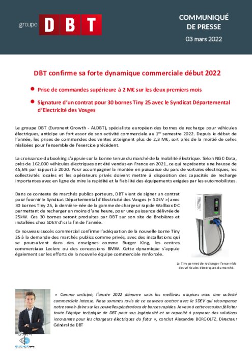 Le groupe DBT, spécialiste européen des bornes de recharge pour véhicules électriques, anticipe un fort essor de son activité commerciale au 1er semestre 2022. Depuis le début de