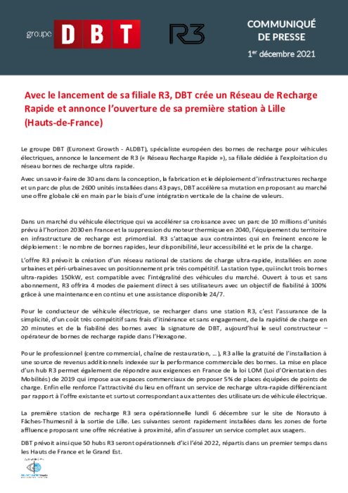 Le groupe DBT, spécialiste européen des bornes de recharge pour véhicules électriques, annonce le lancement de R3 (« Réseau Recharge Rapide »), sa filiale dédiée à l’exploitation du réseau bornes de recharge ultra rapide. Avec un savoir-faire de 30 ans dans la conception, la fabrication et le déploiement d’infrastructures recharge et un parc de plus de 2600 unités installées dans 43 pays, DBT accélère sa mutation en proposant au marché une offre globale clé en main...