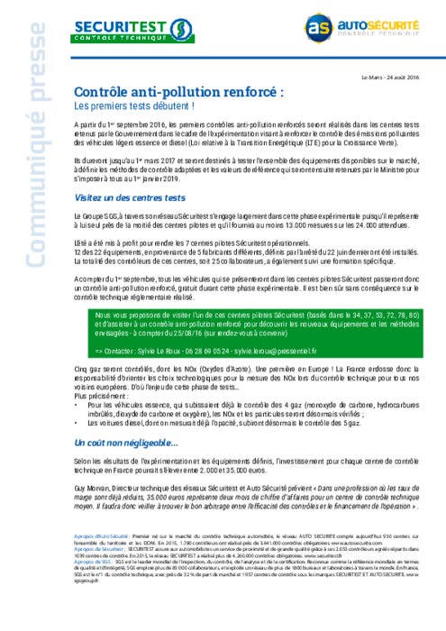 A partir du 1er septembre 2016, les premiers contrôles anti-pollution renforcés seront réalisés dans les centres tests retenus par le Gouvernement dans le cadre de l'expérimentation visant à renforcer le contrôle des émissions polluantes des véhicules légers essence et diesel (Loi relative à la Transition Energétique (LTE) pour la Croissance Verte). Ils dureront jusqu'au 1er mars 2017 et seront destinés à tester l'ensemble des équipements disponibles sur le marché.