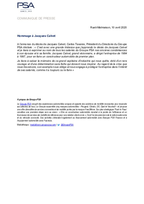 "Jacques Calvet, grand visionnaire, a dirigé l'entreprise de 1984 à 1997, pour en faire un constructeur automobile de premier plan. Je tiens à saluer la mémoire de ce grand capitaine d'industrie qui nous quitte, doté d'un rare courage et d'une détermination sans faille qui doit nous inspirer", a ajouté M. Tavares.