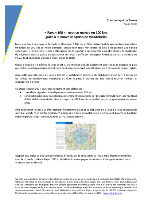 Grâce à l'option " itinéraire le plus court ", ViaMichelin calcule également pour nous la distance la plus courte lors de chaque déplacement, récurrent ou occasionnel, en optimisant ainsi l'ensemble de nos trajets. Avec cette nouvelle option " Rayon 100 km ", ViaMichelin aide les automobilistes, d'une part, à respecter les limites de déplacement autorisées et, d'autre part, à profiter de leur liberté tout en limitant la propagation du virus.