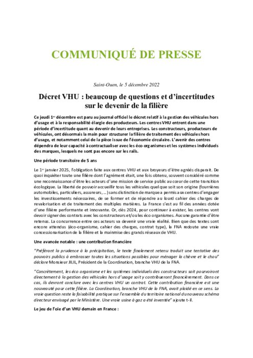 Ce jeudi 1er décembre est paru au journal officiel le décret relatif à la gestion des véhicules hors d’usage et à la responsabilité élargie des producteurs. Les centres VHU entrent dans une période d’incertitude quant au devenir de leurs entreprises. Les constructeurs, producteurs de véhicules, ont désormais la main pour structurer la filière de traitement des véhicules hors d’usage, et notamment celui de la pièce issue de l’économie circulaire.