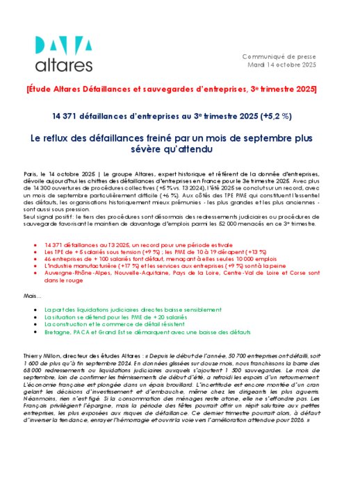 Le groupe Altares, expert historique et référent de la donnée d’entreprises, dévoile aujourd’hui les chiffres des défaillances d’entreprises en France pour le 3e trimestre 2025. Avec plus de 14 300 ouvertures de procédures collectives (+5 % vs. T3 2024), l’été 2025 se conclut sur un record, avec un mois de septembre particulièrement difficile (+6 %). Aux côtés des TPE PME qui constituent l’essentiel des défauts, les organisations historiquement mieux prémunies - les plus grandes et les plus anciennes - sont aussi sous pression.
