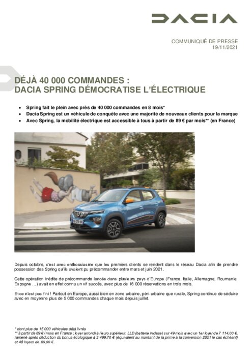 Depuis octobre, c’est avec enthousiasme que les premiers clients se rendent dans le réseau Dacia afin de prendre possession des Spring qu’ils avaient pu précommander entre mars et juin 2021. Cette opération inédite de précommande lancée dans plusieurs pays d’Europe (France, Italie, Allemagne, Roumanie, Espagne …) avait en effet connu un vif succès, avec plus de 16 000 réservations en trois mois...