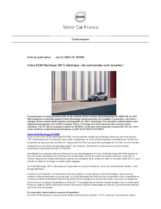 Volvo Cars a officiellement ouvert le carnet de commandes du XC40 Recharge P8 AWD, premier modèle 100 % électrique du constructeur décliné de son SUV à succès, sur certains marchés. Des dizaines de milliers de clients ont manifesté leur intérêt pour le XC40 100 % électrique, et Volvo a déjà reçu plusieurs milliers de commandes fermes avant même l’ouverture officielle des ventes. L’entrée en production du XC40 Recharge P8 et les premières livraisons aux clients sont prévues courant 2020.