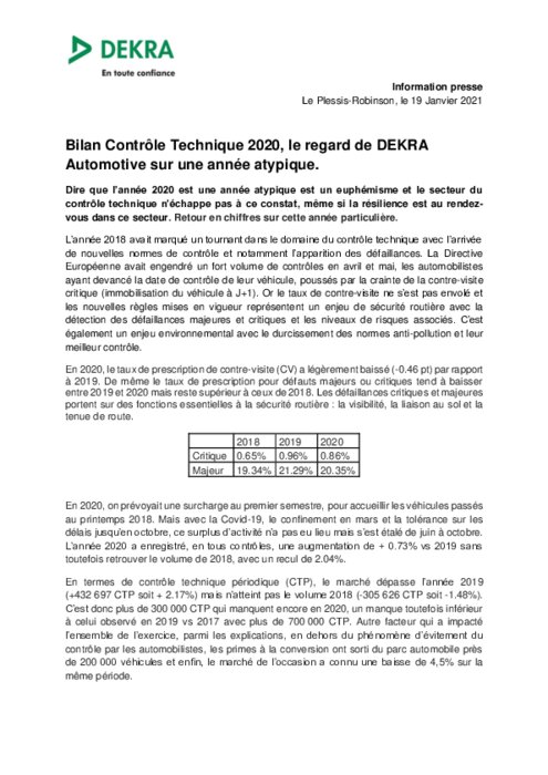 Services 19 janvier 2021 - 17:31 Dire que l’année 2020 est une année atypique est un euphémisme et le secteur du contrôle technique n’échappe pas à ce constat, même si la résilience est au rendez-vous dans ce secteur. Retour en chiffres sur cette année particulière. PDF (163 Ko) Télécharger