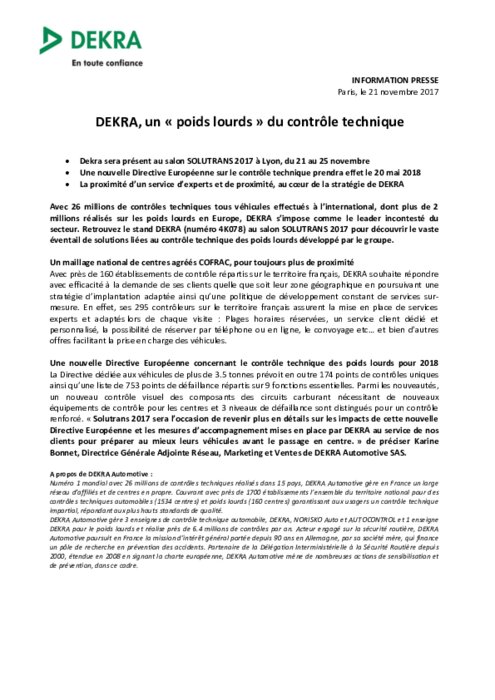 Avec 26 millions de contrôles techniques tous véhicules effectués à l'international, dont plus de 2 millions réalisés sur les poids lourds en Europe, DEKRA s'impose comme le leader incontesté du secteur. Retrouvez le stand DEKRA (numéro 4K078) au salon SOLUTRANS 2017 pour découvrir le vaste éventail de solutions liées au contrôle technique des poids lourds développé par le groupe.