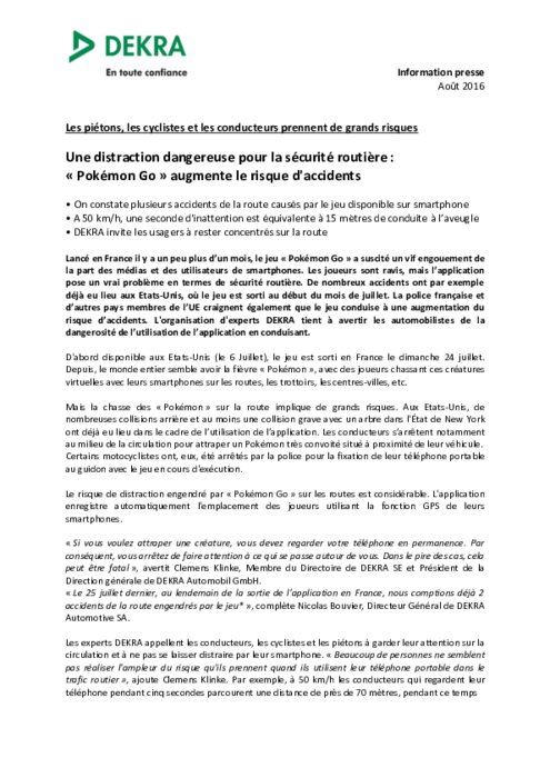 Lancé en France il y a un peu plus d’1 mois, le jeu " Pokémon Go " a suscité un vif engouement de la part des médias et des utilisateurs de smartphones. Les joueurs sont ravis, mais l’application pose un vrai problème en termes de sécurité routière. De nombreux accidents ont par exemple déjà eu lieu aux Etats-Unis, où le jeu est sorti au début du mois de juillet. L'organisation d'experts DEKRA tient à avertir les automobilistes de la dangerosité de l’utilisation de l’application en conduisant.