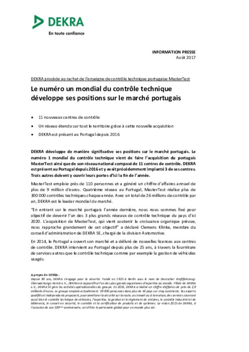 DEKRA développe de manière significative ses positions sur le marché portugais. Le numéro 1 mondial du contrôle technique vient de faire l'acquisition du portugais MasterTest ainsi que de son réseau national composé de 11 centres de contrôle. DEKRA est présent au Portugal depuis 2016 et y avait précédemment implanté 3 de ses centres. Trois autres doivent y ouvrir leurs portes d'ici la fin de l'année.