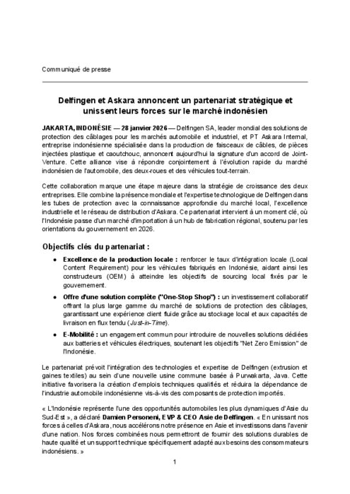 Delfingen SA, leader mondial des solutions de protection des câblages pour les marchés automobile et industriel, et PT Askara Internal, entreprise indonésienne spécialisée dans la production de faisceaux de câbles, de pièces injectées plastique et caoutchouc, annoncent aujourd'hui la signature d'un accord de Joint-Venture. Cette alliance vise à répondre conjointement à l'évolution rapide du marché indonésien de l'automobile, des deux-roues et des véhicules tout-terrain.