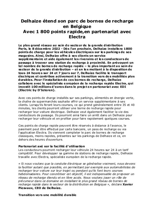 Dès l'an prochain, Delhaize installera 1800 points de charge pour les véhicules électriques sur les parkings de ses magasins. Ainsi, Delhaize offre à ses clients un service supplémentaire et aide également les riverains et les conducteurs de passage à trouver une station de recharge à proximité. En prévoyant un tel nombre de bornes de recharge rapide.