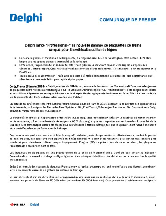 Delphi, marque de PHINIA Inc., annonce le lancement de “Professional+” une nouvelle gamme de plaquettes de freins spécialement conçue pour les véhicules utilitaires légers (VUL). “Professional+ » a été conçue pour résister aux conditions exigeantes de freinages fréquents et de charges élevées typiques de l'utilisation en flotte. Elle offre une durée de vie de plaquette plus longue et une valeur ajoutée pour l’atelier.