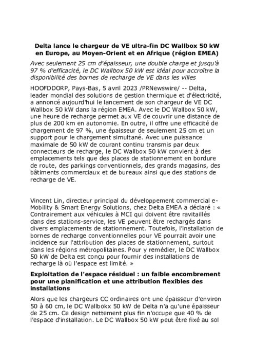 Delta, leader mondial des solutions de gestion thermique et d'électricité, a annoncé aujourd'hui le lancement de son chargeur de VE DC Wallbox 50 kW dans la région EMEA. Avec le DC Wallbox 50 kW, une heure de recharge permet aux VE de couvrir une distance de plus de 200 km en autonomie.