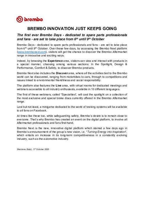 Les Journées Brembo - dédiées aux professionnels des pièces de rechange et aux fans - auront lieu du 6 au 9 octobre. Au cours de ces quelques jours, en accédant à la plateforme Brembo Next (www.brembonext.com), les visiteurs auront la chance de découvrir la gamme Brembo Aftermarket de manière innovante et passionnante.