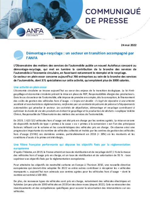 L’Observatoire des métiers des services de l’automobile publie un nouvel Autofocus consacré au démontage-recyclage, qui met en lumière la contribution de la branche des services de l’automobile à l’économie circulaire, en favorisant notamment le réemploi et le recyclage. Ce secteur en plein essor concerne aujourd’hui 766 entreprises au sein de la branche des services de l’automobile, dont 371 spécialisées sur cette activité, qui emploient plus de 3000 salariés.