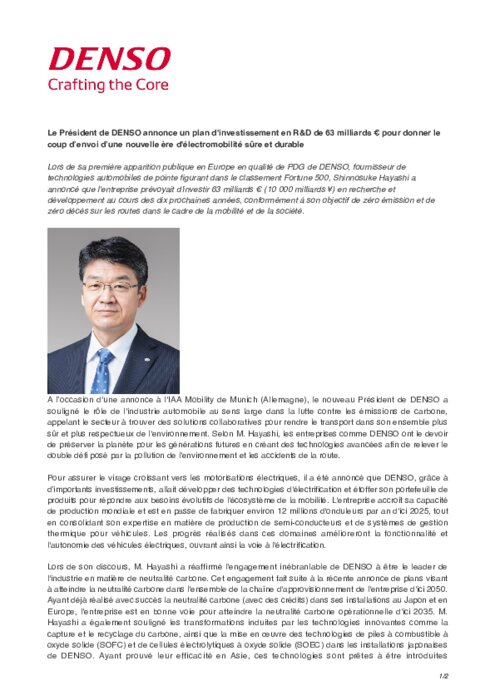 Lors de sa première apparition publique en Europe en sa qualité de PDG de Denso, Shinnosuke Hayashi a annoncé que l'entreprise prévoyait d'investir 63 Md€ en "Recherche et développement" au cours des dix prochaines années, conformément à son objectif de zéro émission et de zéro décès sur les routes dans le cadre de la mobilité et de la société.