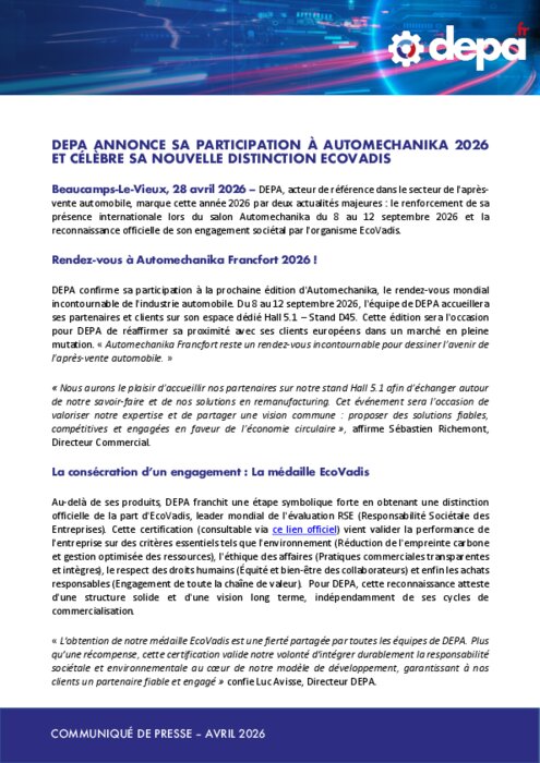 Depa, acteur de référence dans le secteur de l'après vente automobile, marque cette année 2026 par deux actualités majeures : le renforcement de sa présence internationale lors du salon Automechanika du 8 au 12 septembre et la reconnaissance officielle de son engagement sociétal par l'organisme EcoVadis.