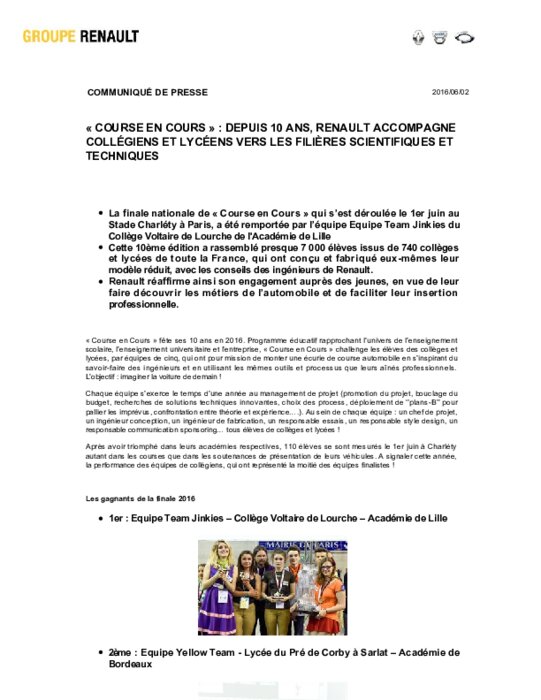 La finale nationale de "Course en Cours" qui s’est déroulée le 1er juin au Stade Charléty à Paris, a été remportée par l’équipe Equipe Team Jinkies du Collège Voltaire de Lourche de l'Académie de Lille. Cette 10ème édition a rassemblé presque 7 000 élèves issus de 740 collèges et lycées de toute la France, qui ont conçu et fabriqué eux-mêmes leur modèle réduit, avec les conseils des ingénieurs de Renault. Renault réaffirme ainsi son engagement auprès des jeunes, en vue de leur faire découvrir l