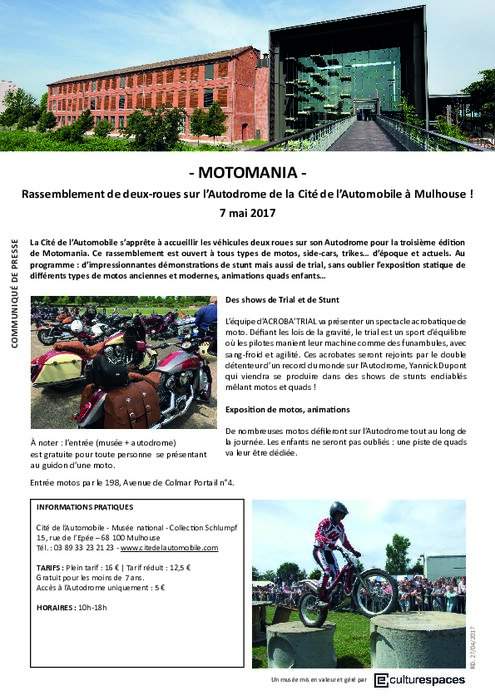 La Cité de l’Automobile s’apprête à accueillir les véhicules deux roues sur son Autodrome pour la troisième édition de Motomania. Ce rassemblement est ouvert à tous types de motos, side-cars, trikes… d’époque et actuels. Au programme : d’impressionnantes démonstrations de stunt mais aussi de trial, sans oublier l’exposition statique de différents types de motos anciennes et modernes, animations quads enfants...