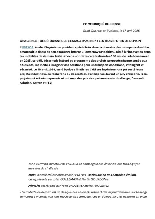 L’ESTACA, école d’ingénieurs post-bac spécialisée dans le domaine des transports durables, organisait la finale de son challenge interne « Tomorrow’s Mobility » dédié à l’innovation dans les mobilités de demain. Initié à l’occasion de la célébration des 100 ans de l’établissement en 2025, ce défi, désormais intégré au programme des projets proposés chaque année aux étudiants, les incite à imaginer des solutions pour un transport décarboné, intelligent et sécurisé. Le 16 avril 2026, les 6 équipes finalistes d’élèves ingénieurs ont présenté leurs projets industriels, de recherche ou de création d’entreprise devant un jury d’experts. Trois projets ont été récompensés et ont reçu des prix des partenaires du challenge, Dassault Aviation, Safran et FEV.