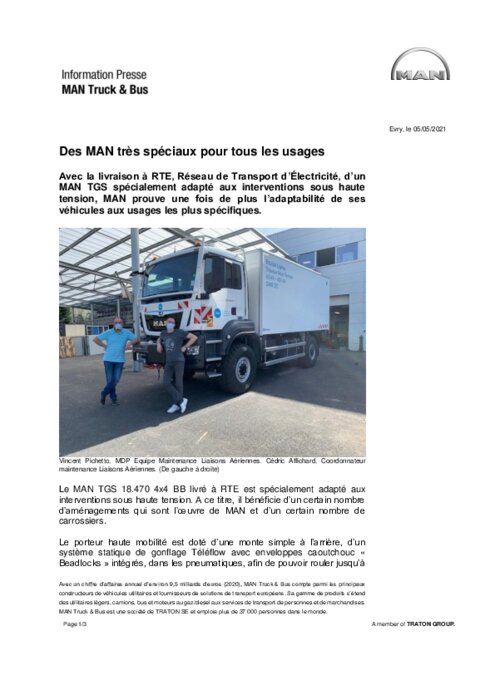Constructeurs 18 mai 2021 - 19:11 Avec la livraison à RTE, Réseau de Transport d’Électricité, d’un MAN TGS spécialement adapté aux interventions sous haute tension, MAN prouve une fois de plus l’adaptabilité de ses véhicules aux usages les plus spécifiques. PDF (449 Ko) Télécharger