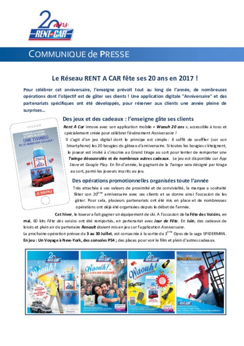 En 2017, le réseau français de location auto a 20 ans. L'anniversaire, abordé sous l'angle festif tout au long de l'année, est aussi l'occasion de présenter les nombreuses innovations du Groupe français, en matière de mobilité. Attentive aux besoins des professionnels comme des particuliers, l'enseigne se démarque par son positionnement "de proximité", proche des clients géographiquement (maillage important sur la France) et proche de la demande quotidienne.