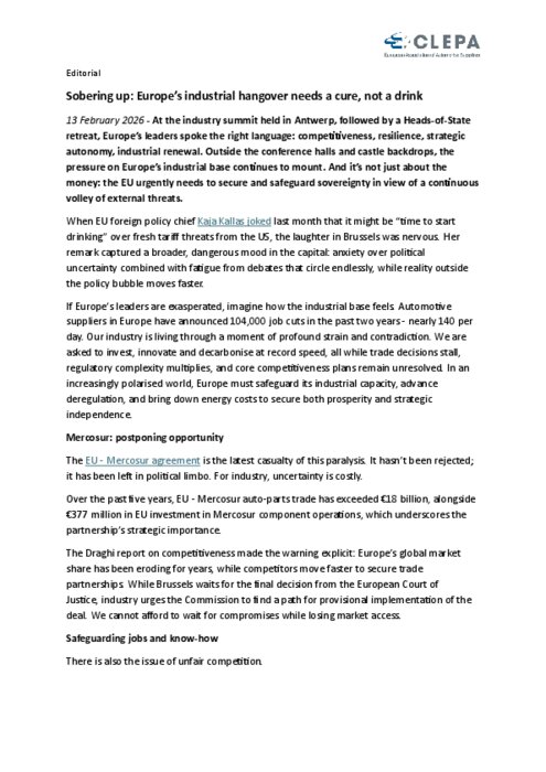Désintoxication industrielle : l’Europe a besoin d’un remède de fond, pas d’un simple palliatif (Clepa)
