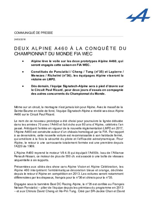 Alpine lève le voile sur les deux prototypes Alpine A460, qui seront engagés cette saison en FIA WEC. Constitués de Panciatici / Cheng / Tung (n°35) et Lapierre / Menezes / Richelmi (n°36), les équipages Alpine viseront la victoire en LMP2. Dès demain, l’équipe SignatechAlpine sera à pied d’œuvre sur le Circuit Paul Ricard, pour deux jours d’essais en compagnie des autres concurrents du Championnat du Monde.