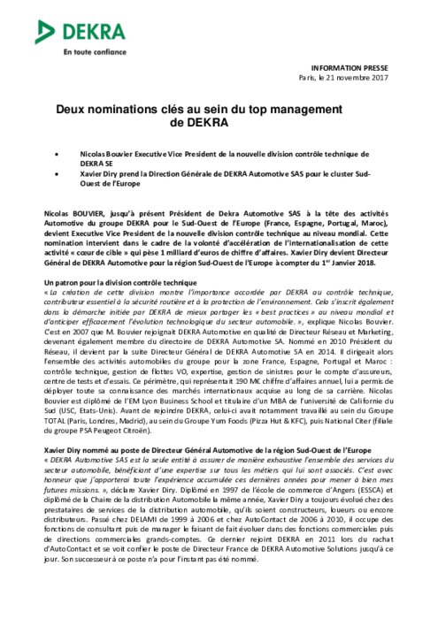 Nicolas BOUVIER, jusqu'à présent Président de Dekra Automotive SAS à la tête des activités Automotive du groupe DEKRA pour le Sud-Ouest de l'Europe (France, Espagne, Portugal, Maroc), devient Executive Vice President de la nouvelle division contrôle technique au niveau mondial. Xavier Diry devient Directeur Général de DEKRA Automotive pour la région Sud-Ouest de l’Europe à compter du 1er Janvier 2018.