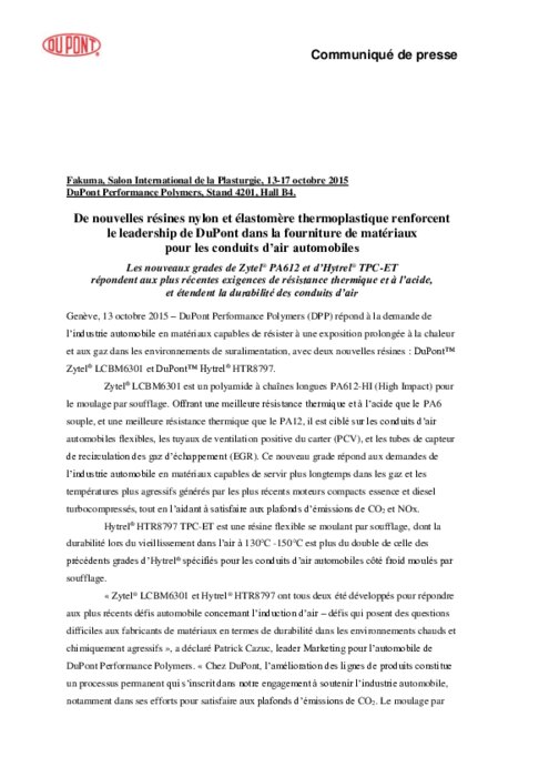DuPont Performance Polymers répond à la demande de l’industrie automobile en matériaux capables de résister à une exposition prolongée à la chaleur et aux gaz dans les environnements de suralimentation, avec deux nouvelles résines : DuPont Zytel LCBM6301 et DuPont Hytrel HTR8797. Zytel LCBM6301 est un polyamide à chaînes longues PA612-HI (High Impact) pour le moulage par soufflage.