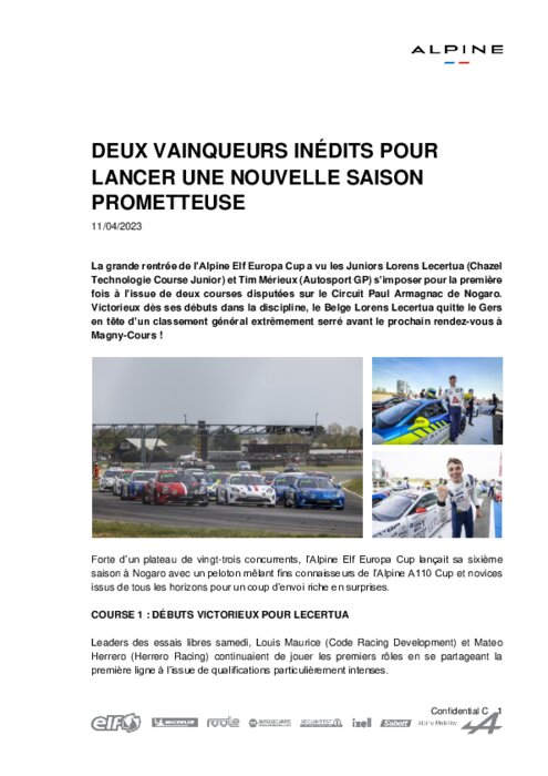 La grande rentrée de l’Alpine Elf Europa Cup a vu les Juniors Lorens Lecertua (Chazel Technologie Course Junior) et Tim Mérieux (Autosport GP) s’imposer pour la première fois à l’issue de deux courses disputées sur le Circuit Paul Armagnac de Nogaro. Victorieux dès ses débuts dans la discipline, le Belge Lorens Lecertua quitte le Gers en tête d’un classement général extrêmement serré avant le prochain rendez-vous à Magny-Cours.