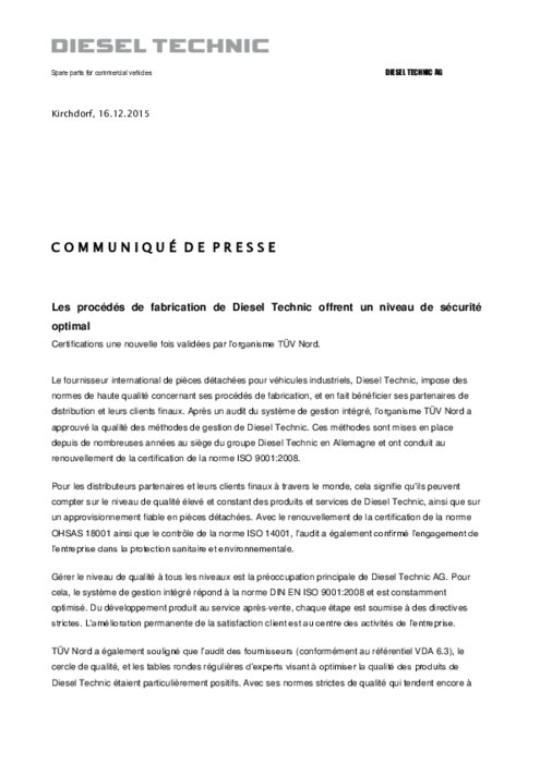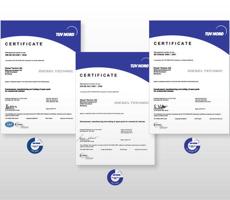 Le fournisseur international de pièces détachées pour véhicules industriels, Diesel Technic, impose des normes de haute qualité concernant ses procédés de fabrication, et en fait bénéficier ses partenaires de distribution et leurs clients finaux. Après un audit du système de gestion intégré, l’organisme TÜV Nord a approuvé la qualité des méthodes de gestion de Diesel Technic. Ces méthodes sont mises en place depuis de nombreuses années au siège du groupe Diesel Technic en Allemagne.