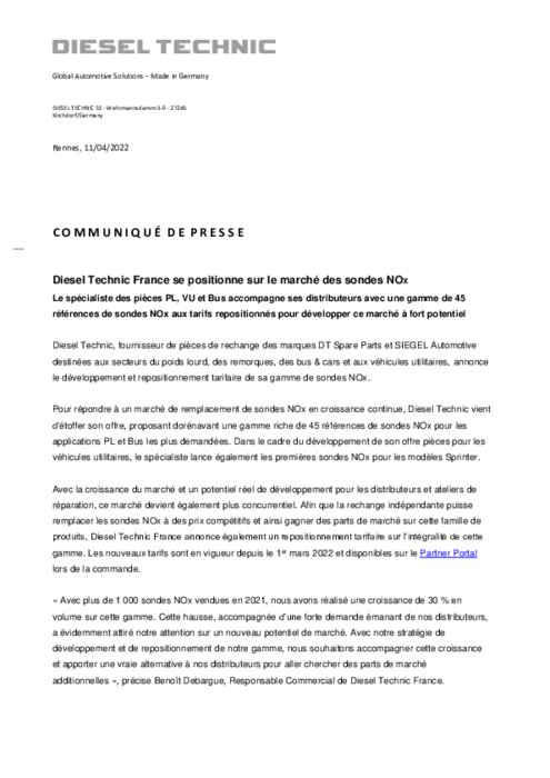 Le spécialiste des pièces PL, VU et Bus accompagne ses distributeurs avec une gamme de 45 références de sondes NOx aux tarifs repositionnés pour développer ce marché à fort potentiel Diesel Technic, fournisseur de pièces de rechange des marques DT Spare Parts et SIEGEL Automotive destinées aux secteurs du poids lourd, des remorques, des bus & cars et aux véhicules utilitaires, annonce le développement et repositionnement tarifaire de sa gamme de sondes NOx.